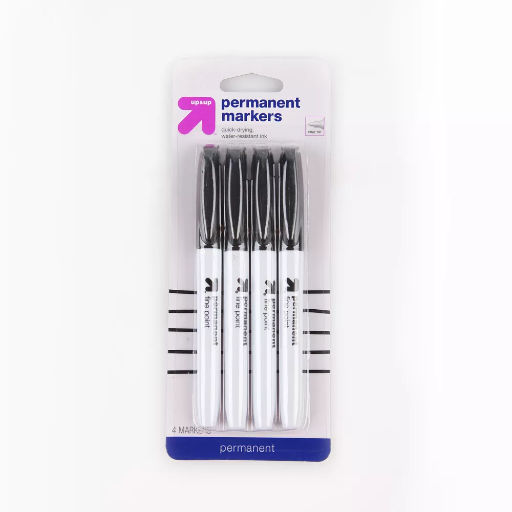 These 4-Count Fine Tip Permanent Markers from up & up™ can be used for a variety of different needs around the home and office. This pack of four permanent markers feature a solid black color that stands out against almost any background, making them perfect for writing on cardboard or posterboard or marking up important documents. Plus, with quick-drying, water-resistant ink, whatever you write will stay looking great for longer.