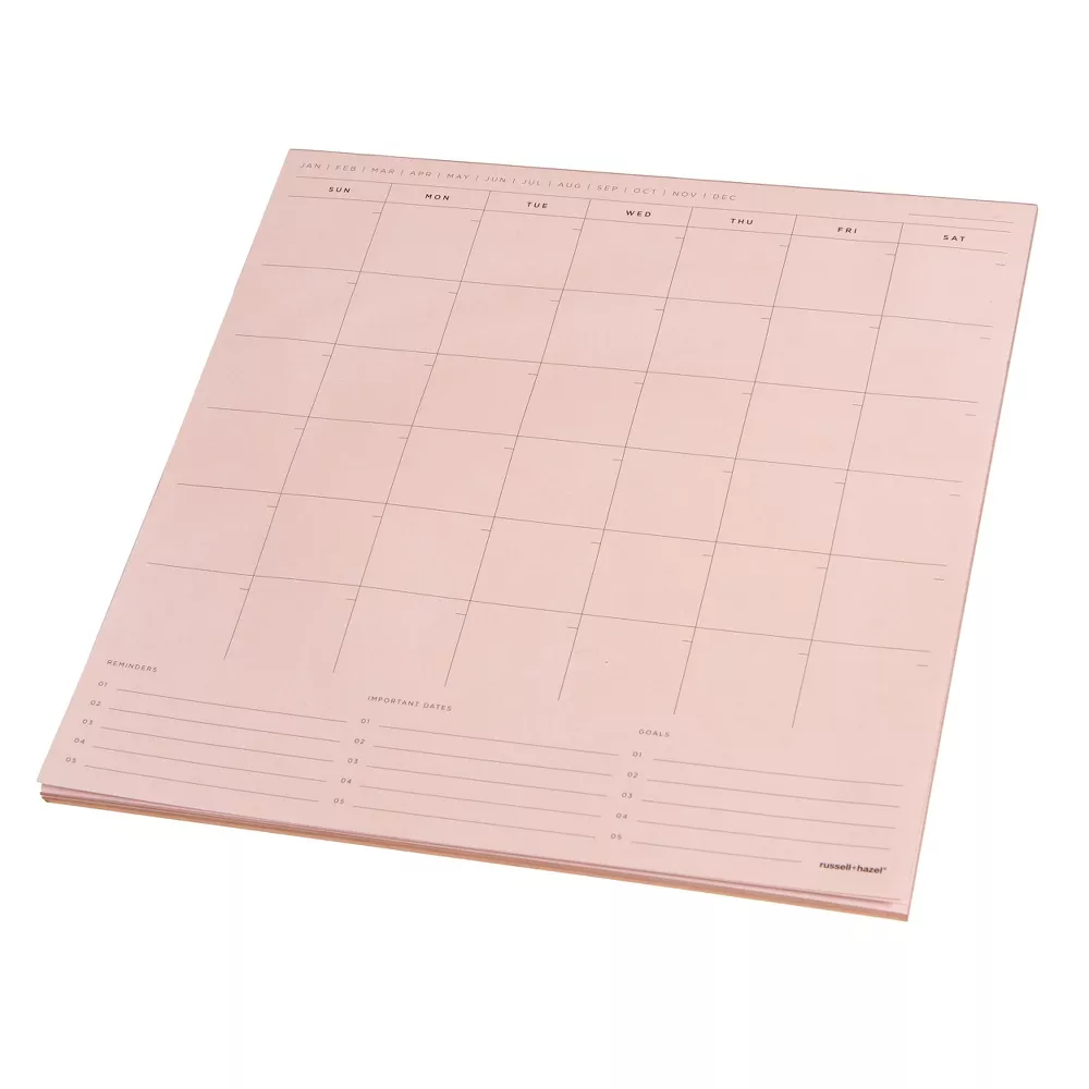Add life to your work with this two year perpetual planning note pad set from russel+hazel fundamentals. This set includes notepads featuring metallic gilded edges, each with different tools for helping to keep you organized. The largest blush pad is 10.5″ x 10.5″ and features an undated monthly calendar with spaces for tracking reminders, important dates, and goals