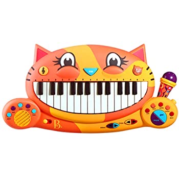 Budding musicians rejoice! Meowsic™ from B. toys is an interactive cat piano with a ton of fun features for your little Mozart to enjoy. Made with music and sounds all around, this keyboard comes with endless opportunities for musical exploration. Choose between sounds such as piano, bells, organ, and more, or play with rhythms like rock, samba, or disco! The Meowsic™ keyboard also comes with a retractable toy microphone for some sing-along fun. And the features don’t end here – your little musician can record their mini masterpieces using the record and playback buttons! This musical toy for toddlers also comes with a handy lyric book that helps your child build early language skills. And because we at B. keep the environment in mind, parents will also be happy to know that our packaging is 100% recyclable. 4 AA batteries are required and included. Recommended for toddlers 2 years and over.