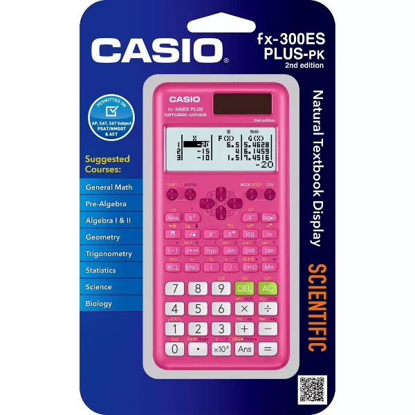 Casio FX-300ESPLS2-S 2nd Edition Scientific Calculator with sleek new design and slide on hard case with Natural Textbook Display and improved math functionality. 262 Built-in Math Functions:, including basic and advanced scientific, exponential and trigonometric, fractions, regression analysis and more. It has been designed as the perfect choice for middle school through high school students learning General Math, Trigonometry, Statistics, Algebra I and II, Pre-Algebra, Geometry, Physics. Entry Logic: V.P.A.M. operating system. Solar power with battery back-up. Dimensions: W 3 1/8 x L 6 3/8 x H 1/2 inches 3.7 oz. Color Pink