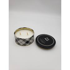 This cute black and white plaid tin candle is scented in Cozy Plaid. the candle is 3.5oz. Lead free wick.