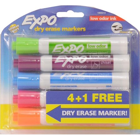 Get ready to write with these EXPO Low Odor Dry Erase Markers in Bright Colors. They come in a package of 4 + 1 bonus pen and are a helpful office or classroom tool. These chisel-tip markers allow for writing versatility. They can create thick or thin lines depending on how you hold them. These low-odor markers can be used on whiteboards or any other dry erase surface. The ink wipes off easily with an Expo dry eraser or cleaning cloth. Be sure you have enough for all your writing needs.