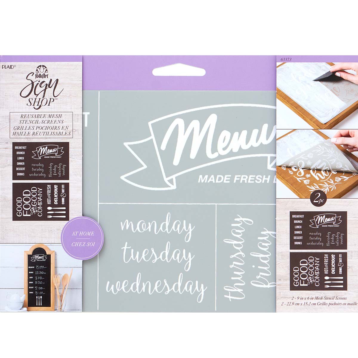Easily stencil a sign for your kitchen with the FolkArt Sign Shop Good Food Mesh Stencil Screens. This 2-piece mesh stencil pack features words and icons to create your own menu and sign for your kitchen. Create highly detailed designs on a variety of surfaces like wood, canvas, fabric, and more. These mesh stencil screens have an adhesive backing and can be repositioned. Reuse these screens over and over again by simply cleaning while wet with mild soap and water after each crafting session. Use these beautiful stencils with the FolkArt Sign Shop Acrylic Stencil Paste for added character and extraordinary detail to your signs. Complete your stencil collection with the FolkArt Sign Shop Good Food Mesh Stencil Screens.