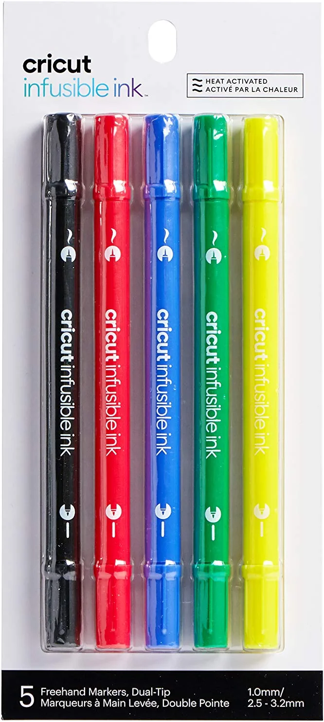 - 5 dual-tip (1. 0 medium point & 2. 5–3. 2 brush tip) Infusible Ink Freehand Markers in Black, Red, Vivid Blue, Green, Yellow