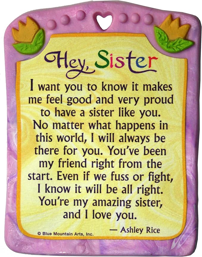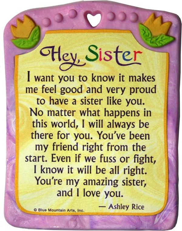 - Blue Mountain Arts Sculpted Resin Magnet, Hey Sister I Want You to Know by Ashley Rice; magnet measures 2-7/8 x 3-3/4 inches
