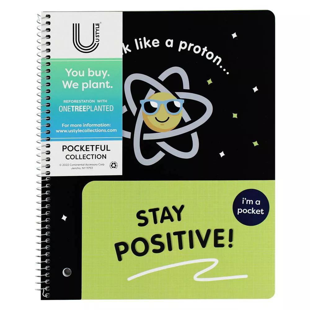 A notebook that promotes positivity and helps reforest the planet! You can be proud that a percentage of your purchase goes to planting trees with One Tree Planted. The UStyle Pocket Notebook features a built-in front pocket to store important papers, great for kids, and for organization. 80 double-sided pages are perforated for easy removal. The wide ruled notebook is perfect for school aged children.